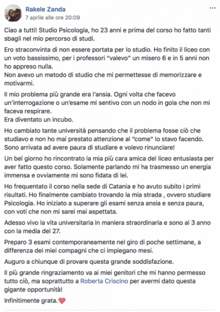 - Potrai dire una volta per tutte addio all’ansia. Consapevole della forza del tuo metodo affronterai lo studio e gli esami con un’energia del tutto nuova e riuscirai a registrare sul libretto un 30 dopo l’altro