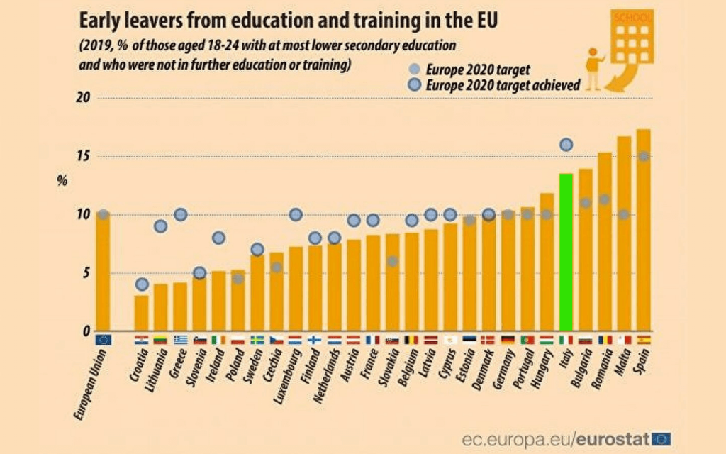 In Italia, circa il 13,5% dei giovani ha abbandonato la scuola prima di raggiungere il diploma. Rispetto all’ultimo decennio, si è registrato un netto miglioramento (erano oltre il 23% nel 2004), ma la quota è ancora ben al di sopra dell’obiettivo che l’Unione Europea aveva stabilito per il 2020, per la quale si richiedeva, ai paesi membri di arrivare alla soglia del 10%.