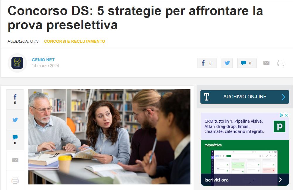 Diventando suoi partner ufficiali, abbiamo, pertanto, potuto estendere il nostro impatto ben oltre le aule, raggiungendo un pubblico più ampio, a partire dalla serie di webinar che abbiamo creato “ad hoc” per i suoi corsisti che sosterranno a breve il concorso per l’immissione in ruolo e quello per diventare Dirigenti Scolastici: abbiamo inoltre iniziato, a partire dal 5 marzo, a pubblicare un blog di “Genio” sul suo sito web e nostri materiali sugli altri canali (rivista cartacea e digitale, newsletter, YouTube) di “Tuttoscuola”.